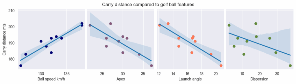 As we want to understand what influence the carry distance of the golf ball, we can draw on a regressive pairplot the relationship between the features and this distance.